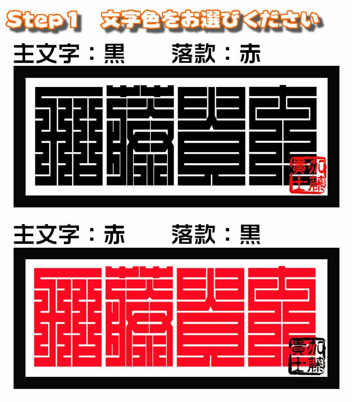 ■文字色:角崩し文字が黒の場合、落款印は赤。逆の配色も選択可能