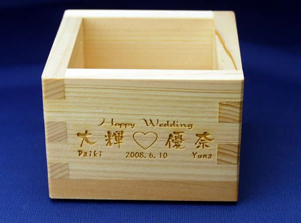 ・ひのき材の一合升にレーザー加工でお二人の名前を彫り込んだ、オリジナル一合升です。