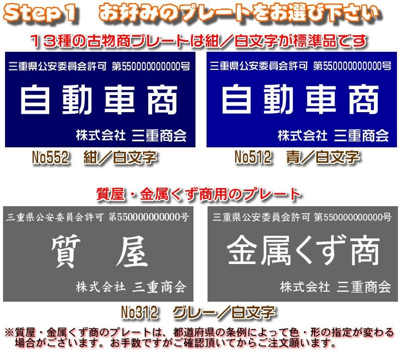 ●質屋・金属くず商のプレートは、都道府県の条例によって色・形の指定が変わる場合がございます。誠に恐れ入りますがご自身でご確認ください。