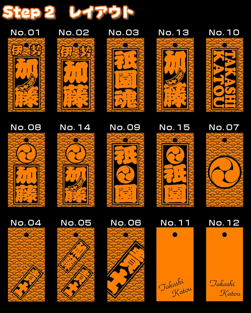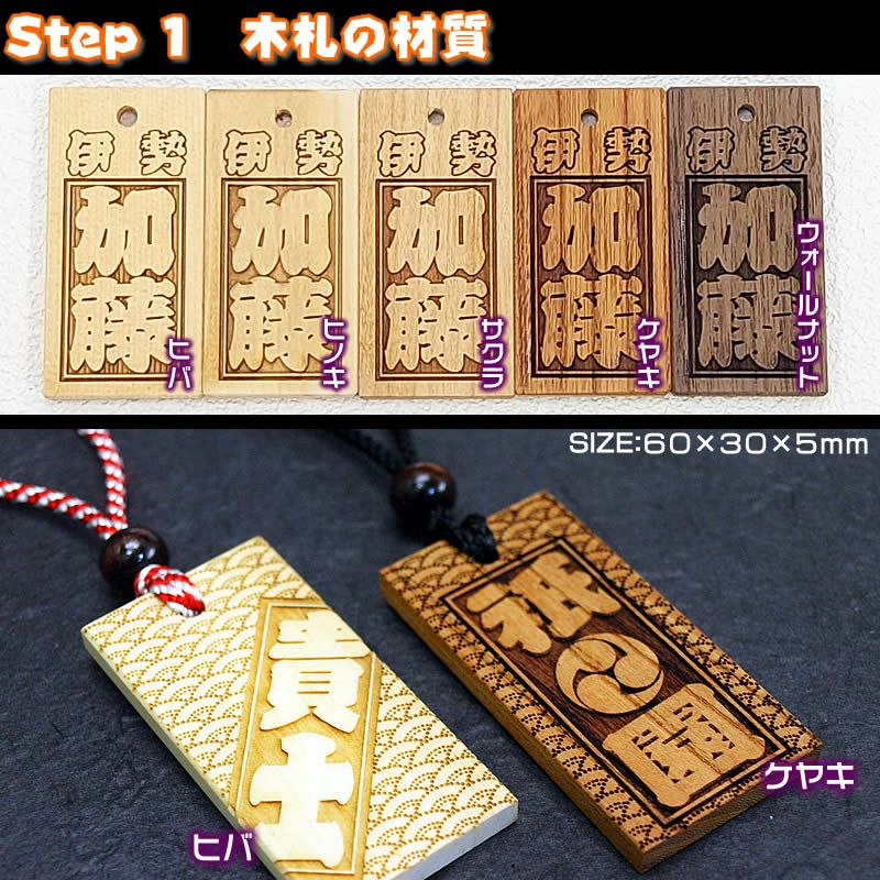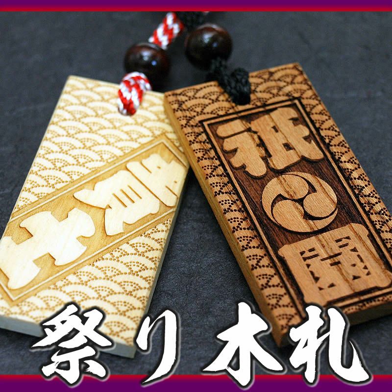 お祭り木札/欅・桧・桜材など5種類【表面にお名前と家紋や梵字と柄加工/裏面無地/60×30×5mm】片面仕様の名入れ千社札・祭り札・喧嘩札/柄は15種類/首紐も23種類から選択可能♪