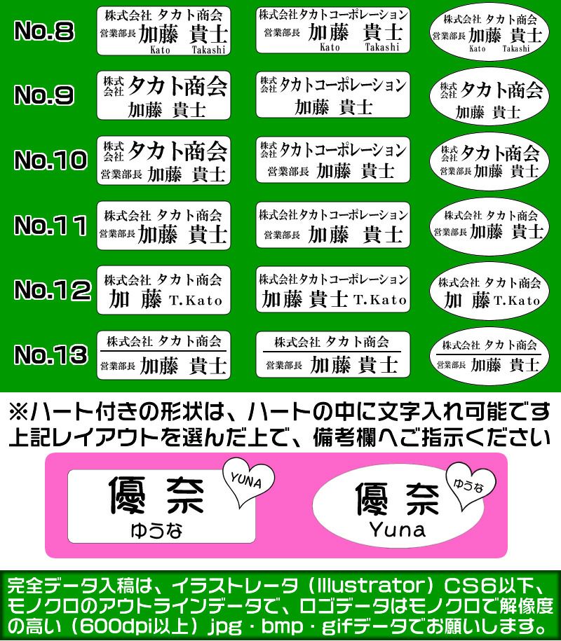 ●ロゴマーク入りや完全データ入稿の場合は、イラストレータ(Illustrator)CS6以下のモノクロのアウトラインデータもしくは、モノクロで解像度の高い(600dpi以上)jpg・bmp・gifデータでメール(raim@raim.ne.jp)に添付下さい。