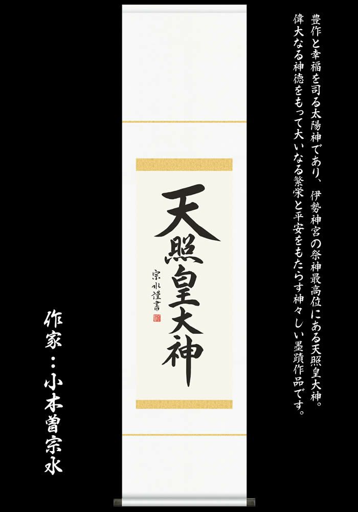 豊作と幸福を司る太陽神であり、伊勢神宮の祭神最高位にある天照皇大神。偉大なる神徳をもって大いなる繁栄と平安をもたらす神々しい墨蹟作品です。