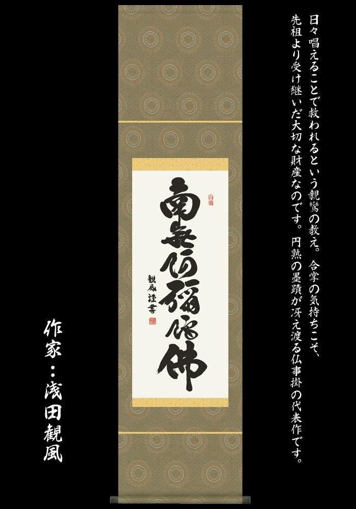 日々唱えることで救われるという親鸞の教え。合掌の気持ちこそ、先祖より受け継いだ大切な財産なのです。円熟の墨蹟が冴え渡る仏事掛の代表作です。