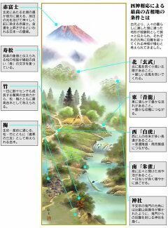 この「風水霊峰四神図」は、山紫水明の趣漂う風趣な山水画を、四神相応の条件で描き、さらに中央の民家を中心に、その東西南北の位置に、各方位を守護するという「四神獣」の姿を隠し絵で配した伝統の構図です。これを床の間に飾ることで、キトラ古墳のように四方に四神を奉ることと同等の厄除け効果となるとされる人気作品です。確かに眺めてみると不思議と心が落ち着き、穏やかな気分になってきます。人は本能的に理想的な風景に 安らぎを覚えるといわれているのです。