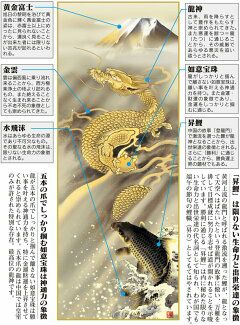 古来、登竜門の故事に倣い、激流を遡った鯉が龍神となって天へ昇る姿は出世栄達の象徴。 金運財運の象徴である旭日の黎明を浴びて黄金色に輝く黄金富士を背に、水飛沫をあげて豪快に跳び、偉大な生命力を感じさせる鯉と、威厳あふれる様で忍び寄る悪災をことごとく追い祓う龍がご尊家を末永く守護してくれることでしょう。