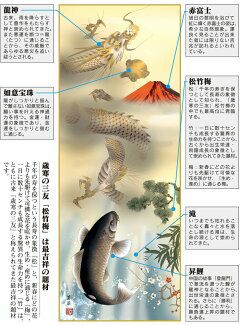 古来、登龍門の故事に倣い激流を遡った鯉が龍神となって天へと昇る姿は出世栄達の象徴。 金運財運の象徴である赤富士を背に、水飛沫をあげ豪快に跳ねる鯉と、威厳あふれる様で忍び寄る悪災をことごとく追い祓う龍がご尊家を末永く守護してくれることでしょう。 「歳寒の三友」と称えられる松竹梅が吉祥の彩を添え、限りない霊験があふれ出る、由緒正しい厄除け題材を一堂に描き上げた重厚な開運作品です。