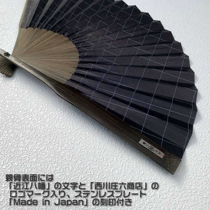 3. 大風量紙扇子24cm【紺/格子柄】SD-NSS 61933 両面紙貼り 近江八幡/西川庄六商店 即日発送【ネコポス送料無料】【832】