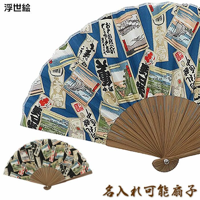 和柄扇子 男性用【浮世絵/黒・青】23cm 扇面・・布/扇骨・・竹