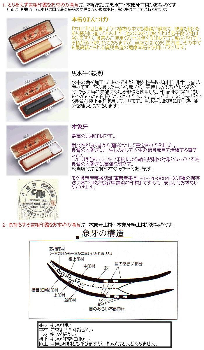 通商産業省認証(事業者番号T-4-24-00040)の『種の保存法に基づく政府登録申請済の印材』 ですので、安心してお求めいただけます。